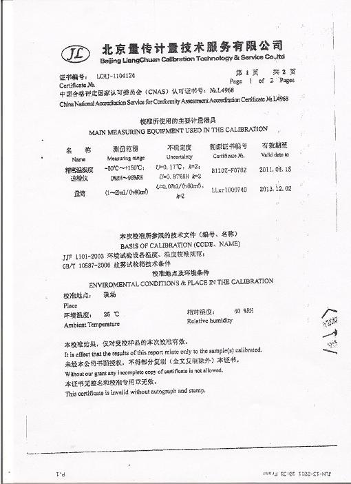 >>鹽霧腐蝕試驗箱校準證書-北京量傳計量-中安電子