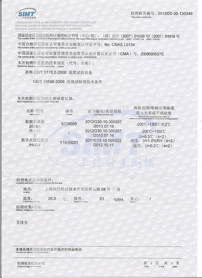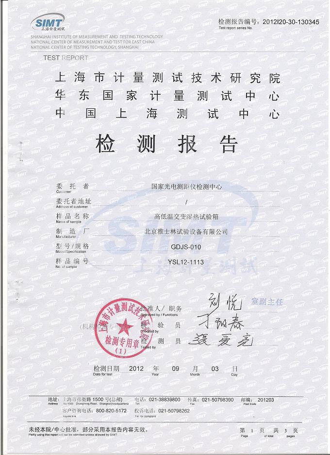 >>高低溫交變濕熱試驗箱檢測報告-上海計量院-國家光電檢測