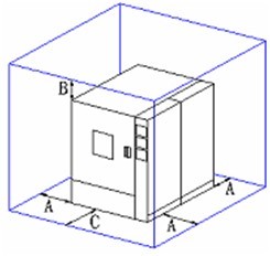 9、高低溫試驗箱周圍應留有適當的使用及維護空間,如下圖所示:注:A:不小于60cm B:不小于60cm C: 不小于70cm
